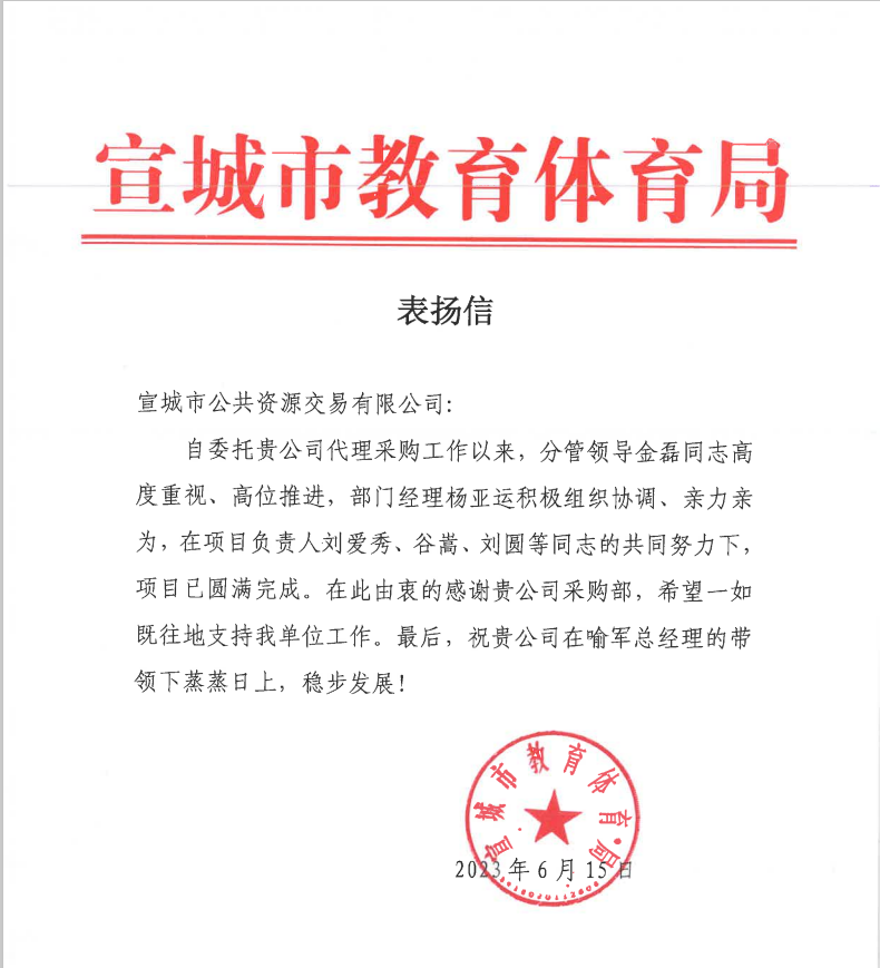 表揚(yáng)信-宣城市教育體育局