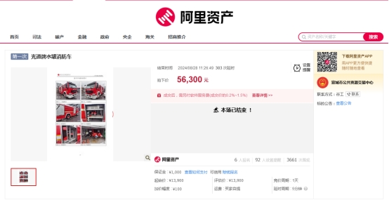 2024年8月28日,由宣城市公共資源交易有限公司代理的宣城市消防救援局水罐消防車網(wǎng)絡(luò)競價項目,通過阿里資產(chǎn)平臺進(jìn)行公開競價。該標(biāo)的為報廢消防車,起拍價為13900元,經(jīng)過395次出價,最終以56300元成交,溢價率為305%。